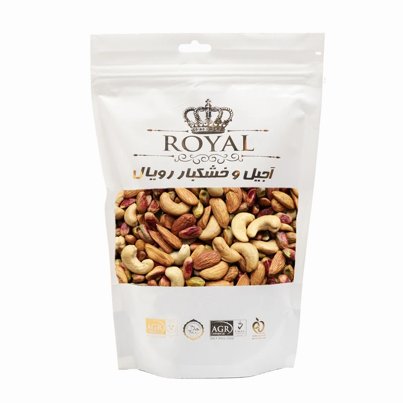مكسرات رويال، بخبرة تمتد لقرن في طهران وتبريز، مدعومة بسنوات من الخبرة العلمية والعملية في تحضير وتقديم المكسرات والفواكه المجففة عالية الجودة، هي واحدة من أفضل العلامات التجارية للمكسرات في إيران. خلطة المكسرات الثلاثية من رويال هي أعلى جودة متوفرة في السوق، وتتميز بتركيبة مناسبة ونضارة. تتكون هذه الخلطة من أفخر المكسرات، وكل مكون منها ذو قيمة غذائية عالية. مع حفنة واحدة من المكسرات المختلطة، يتم توفير معظم الفيتامينات التي يحتاجها جسمك، بالإضافة إلى الحماية من العديد من الأمراض. كل من هذه المكسرات هو قنبلة طاقة ويعتبر وجبة خفيفة صحية بدلاً من الكربوهيدرات الفارغة من المواد المغذية. تشمل خلطة المكسرات الأربعة: الفوسفور، الحديد، المنغنيز، النحاس، الزنك، الكالسيوم، البوتاسيوم، أنواع الفيتامينات A، B، E، وأنواع مختلفة من البروتينات، والمعادن الأساسية والأحماض الدهنية غير المشبعة التي هي مفيدة وحيوية للجسم. هذا النوع من مكسرات رويال، بمكوناته الفاخرة وتركيبته المناسبة، هو الأكثر شعبية في الحفلات والتجمعات. مكونات هذا المنتج تشمل: لب الفستق المملح الفاخر، الكاجو المملح الكبير، واللوز المملح الفاخر مامرا.
